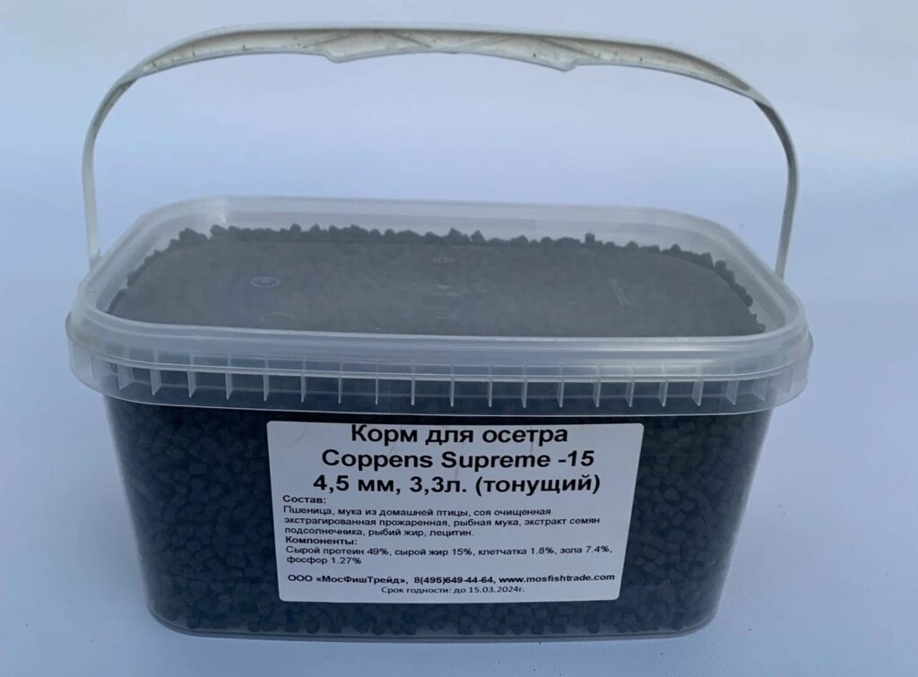 Кормовая смесь высокого качества, подходит для питания осетровых рыб. Безопасность и питательная ценность Coppens подтверждены соответствующей документацией на основании исследований. За основу берутся протеины, жиры, углеводы и витамины, также включены в состав добавки, способствующие улучшению пищеварения и усвоению питательных веществ. Для осетра весом 200-1000 г. Основные вещества: пшеница, мука из домашней птицы, рыбная, соя прожаренная, экстракт подсолнечника, рыбий жир, лецитин. Цена — 753 руб.