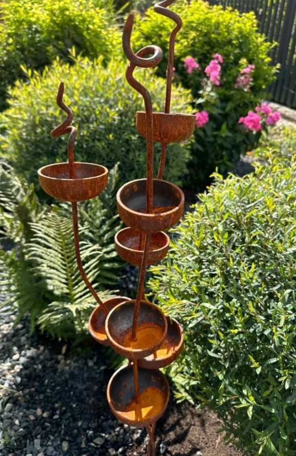 «Ловец дождя» сделан из металла. Минималистичный и ажурный маковой цветок украшен 8-ю чашами разного диаметра, установленными на 3-х металлических прутьях диаметром 6 мм. каждая. Арт-объект впишется в интерьер сада, украшенный живыми цветами, сухоцветами, камнями, мхом или хвойными материалами. Металлическое покрытие обработано специальным составом, создающим эффект естественной ржавчины, который восстанавливается при взаимодействии с окружающей средой. Если покрытие слегка осыпается при перевозке, на свежем воздухе оно быстро вернет первоначальный вид. Помимо декоративной функции, ловец дождя может применяться как поилка для птиц и полезных насекомых. Садовый декор, поилка, размеры: 20х20х115 см., цвет и материал бронза. Цена от 5286 руб.