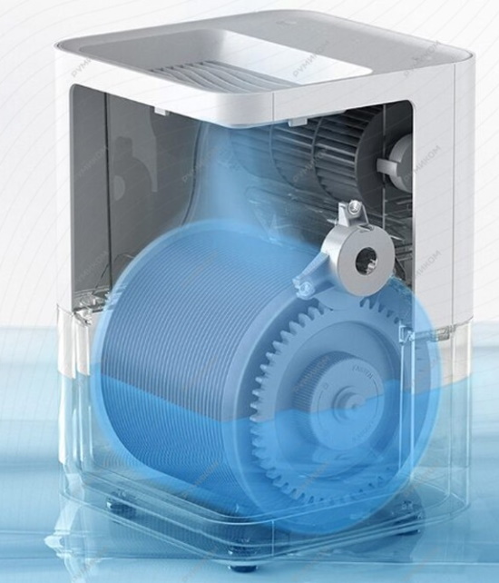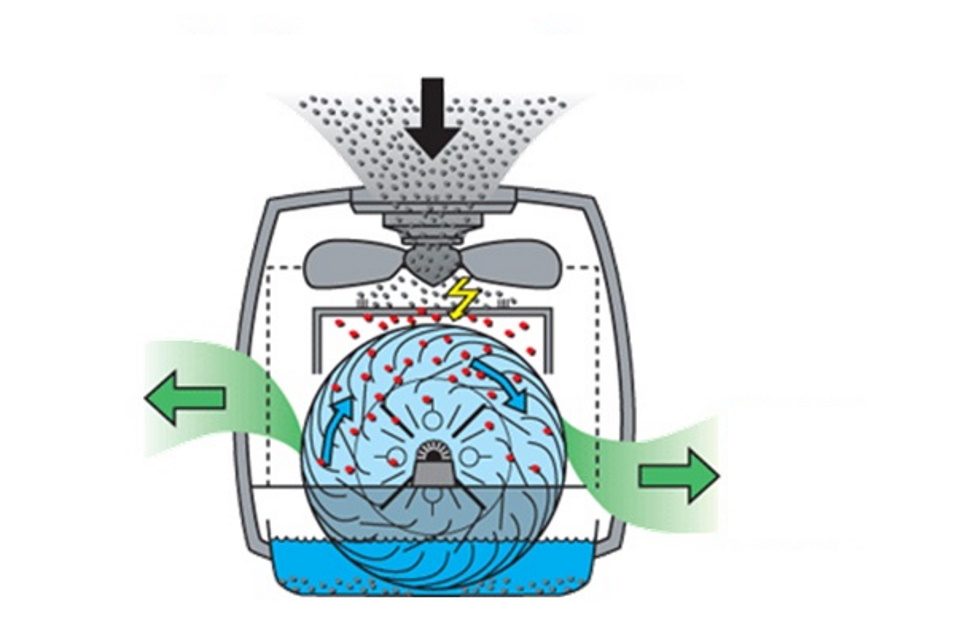 Самое функциональное оборудование, увлажняющее и очищающее воздух от загрязнений и неприятных запахов. Работает путём сдувания водяной пыли с барабана, состоящего из пластин. Сухой поток нагнетается вентилятором и грязь оседает на пластинах, после чего смывается в поддон в процессе вращения.
