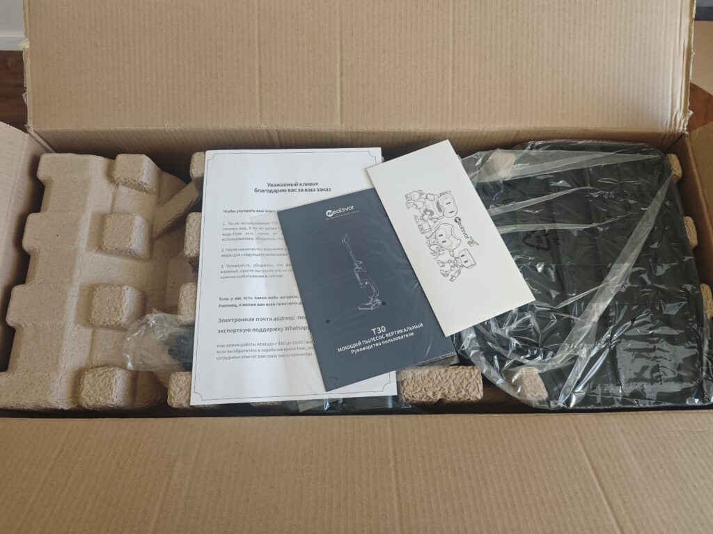Поставляется в картонной коробке. Внутри вспененные блоки, между которыми находятся детали пылесоса (приходит в частично разобранном виде). Сборка не составит труда (прилагается подробная инструкция). Крышка над основным валиком закрывается на защелках. Начинать соединять ее нужно именно с них, а затем опрокидывать к корпусу для фиксации. У валика большой ворс, что помогает вычищать мусор из глубоких щелей.