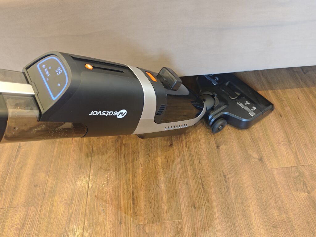 Есть опция уборки пролитой на пол жидкости, это большой плюс для пылесосов такого типа. Собранная жидкость попадает в бак для мусора. За счет того что угол наклона пылесоса небольшой, могут возникнуть трудности с очисткой труднодоступных мест. Роллер валика не доходит до корпуса, при мойке вдоль плинтуса может оставаться слепая зона. Также стоит быть аккуратным при уборке возле длинных штор, тюля, балдахинов мебели, так как при максимальной мощности может засосать ткань на валик.