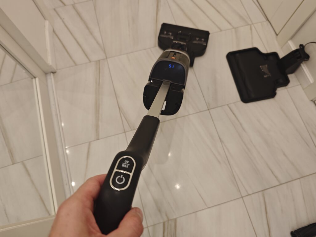 На корпусе расположен яркий светодиодный дисплей, показывающий основные параметры работы: мощность, заряд батареи, резервуар с грязной и чистой водой, самоочистку, AUTO и MAX режимы, УФ-дезинфекцию. Есть индикаторы напоминающие о нехватке воды и о полном пылесборнике.