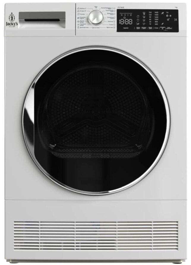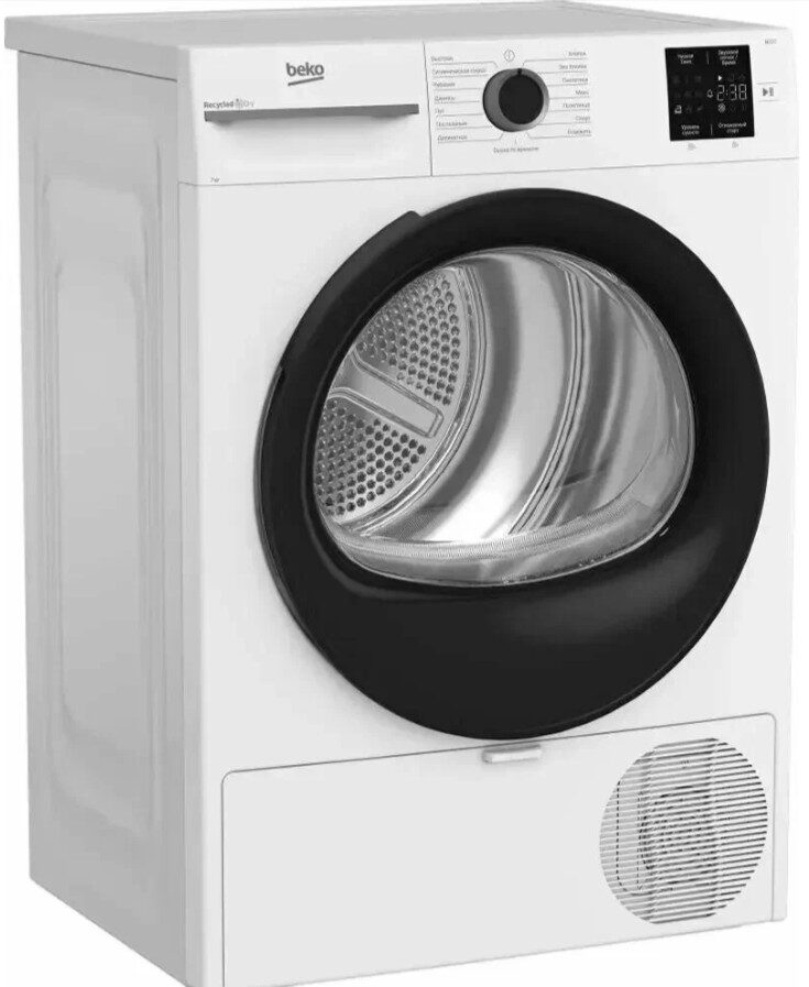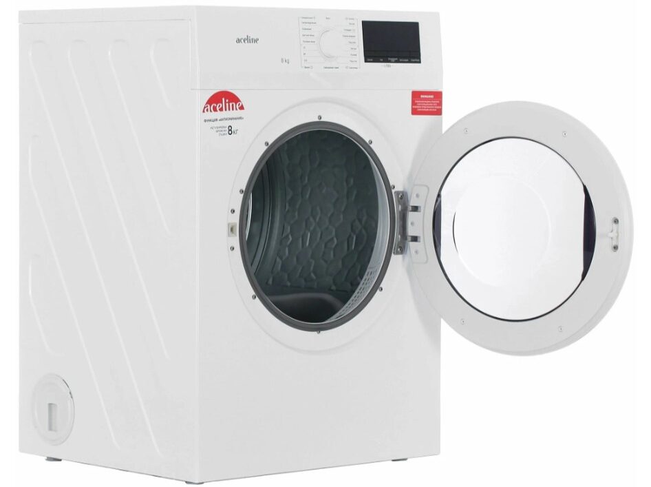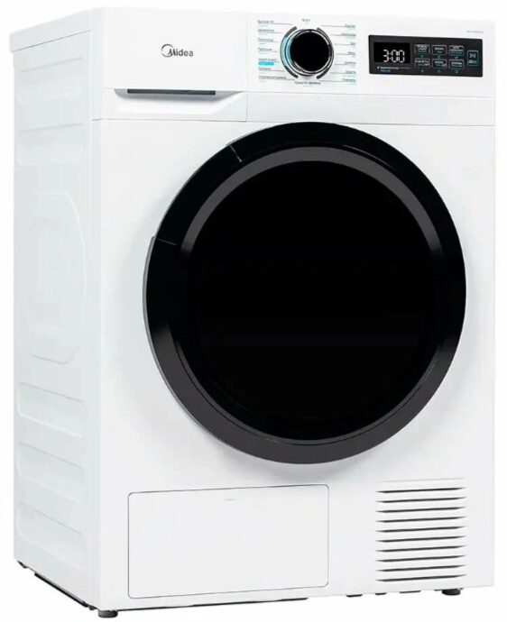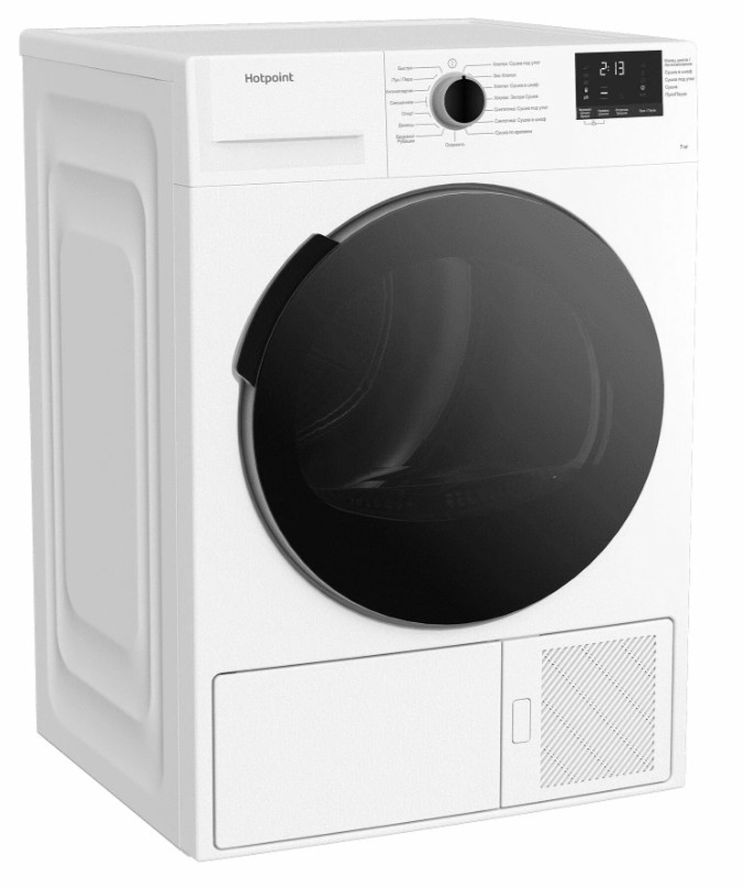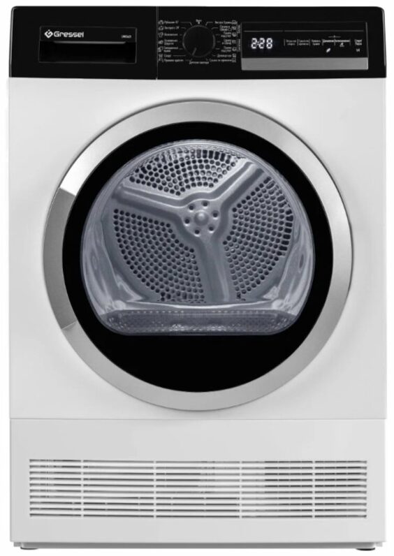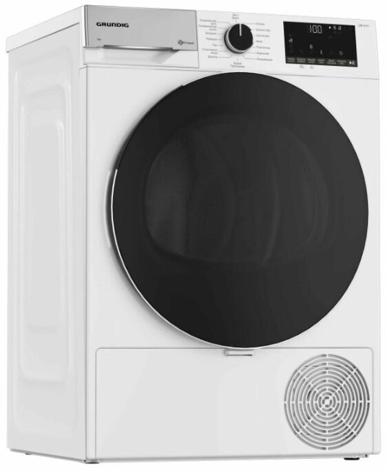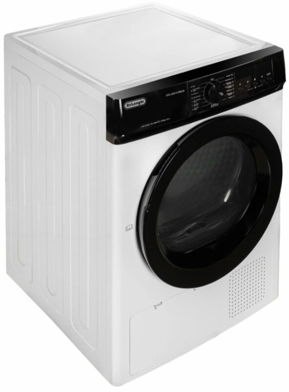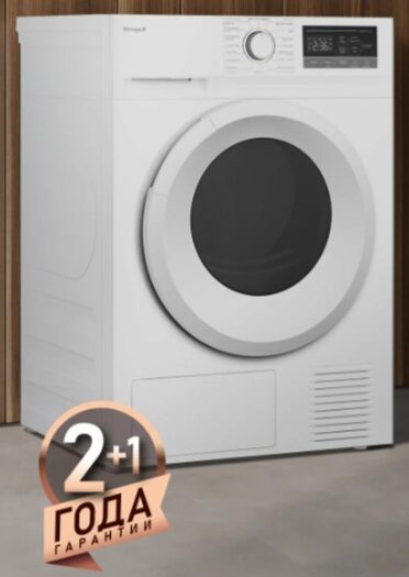 Отдельно стоящая машинка, оборудована тепловой помпой. Загрузка белья достигает 8 кг., и объем на 102 л. минимизируют количество циклов. Предусмотрено электронное управление. Благодаря насосу теплый сухой поддув подается в камеру, удаляя влагу из белья. Затем увлажненный воздух попадает в испаритель, охлаждается, извлеченная влага выводится из системы. Такой цикл повторяется многократно, поддерживая микроклимат внутри барабана. Модель оснащена функцией сушки по остаточной влажности, что предотвращает пересушку и сохраняет структуру волокон ткани. Программа «Против складок» уменьшает образование заломов, облегчая глажку. Опция «Освежение» обновляет вид одежды, избавляет от запаха и грязи без стирки. Программа «Спортивная одежда» обрабатывает изделия из смешанных волокон. Отсроченный старт позволяет планировать начало цикла в другое время, блокирование от детей повышает безопасность. Дисплей и внутренняя подсветка делают контроль за процессом наглядным. Прозрачная дверца упрощает наблюдение за состоянием белья. Открытие двери на 170° способствует удобной загрузке и выгрузке вещей. Тихая работа на уровне 66 дБ. Режимы — хлопок, шерсть, джинсовые изделия, постельные принадлежности, синтетика и смесовые ткани, холодная сушка для чувствительных тканей. Мытье ворсового фильтра, оповещение о завершении цикла, настраивание времени окончания входят в перечень полезных характеристик. Стоимость от 26 608 руб.