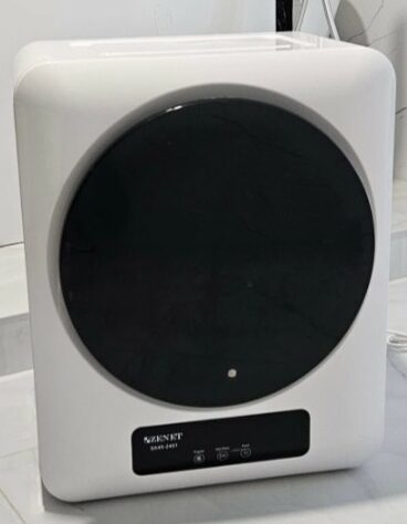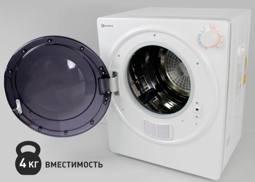 Мини сушилка, белого цвета, максимальная загрузка 4 кг., легко впишется в любое пространство благодаря габаритам 49×46×59,6 см. и весу 18 кг. Управление механическое, без цифровой индикации. В комплект входят сменные фильтры и полка для сушки обуви. Способна справляться с предметами одежды и обувью за одну загрузку. Установка — отдельно стоящая, с фронтальной загрузкой и дверью, открывающейся слева. Потребляет до 800 Вт мощности и генерирует уровень шума до 50 дБ. Устройство не интегрируется в систему «Умный дом. Гарантийный срок 2 года. Приблизительная цена от 32 654 руб.