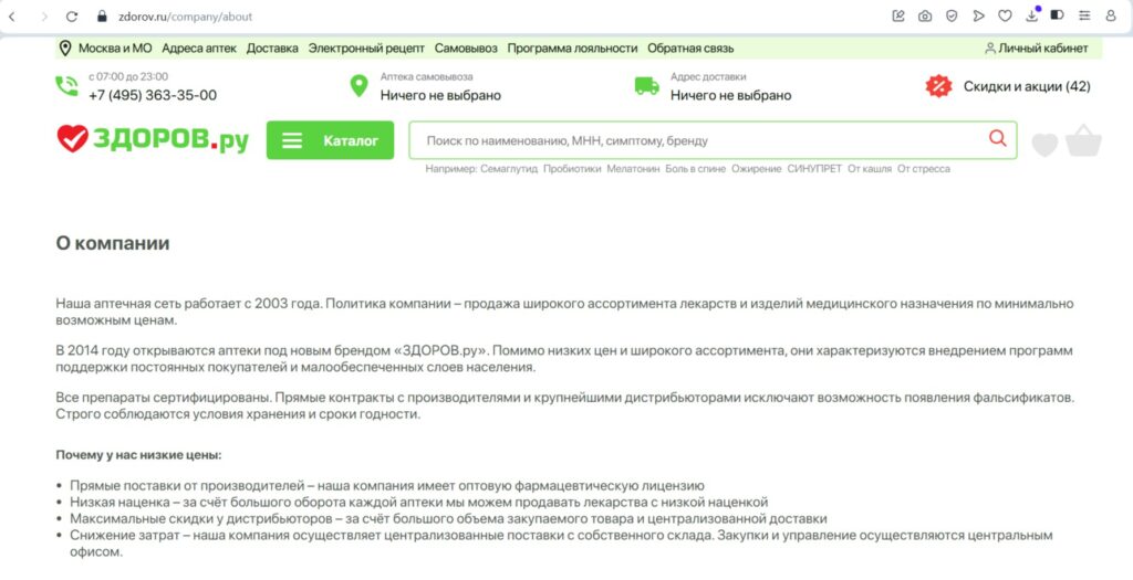 Аптечная сеть, основанная в 2003 году, отличается прямым сотрудничеством с ведущими отечественными и зарубежными производителями, крупными поставщиками. Товары проходят сертификацию. Сеть известна внедрением программ лояльности, поддерживающих отношения с покупателями с ограниченными финансовыми возможностями. Компания разработала систему доставки, охватывая Москву, Московскую область, Нижний Новгород и Санкт-Петербург. Стоимость транспортировки варьируется в зависимости от суммы и веса. Если заказ до 2000 руб., стоимость составляет 179 руб., если выше – осуществляется бесплатно. Прием заявок ведется круглосуточно, график отправки охватывает весь рабочий день. Система расчета включает электронные платежи, с гарантированной защитой персональных данных через использование технологий шифрования.