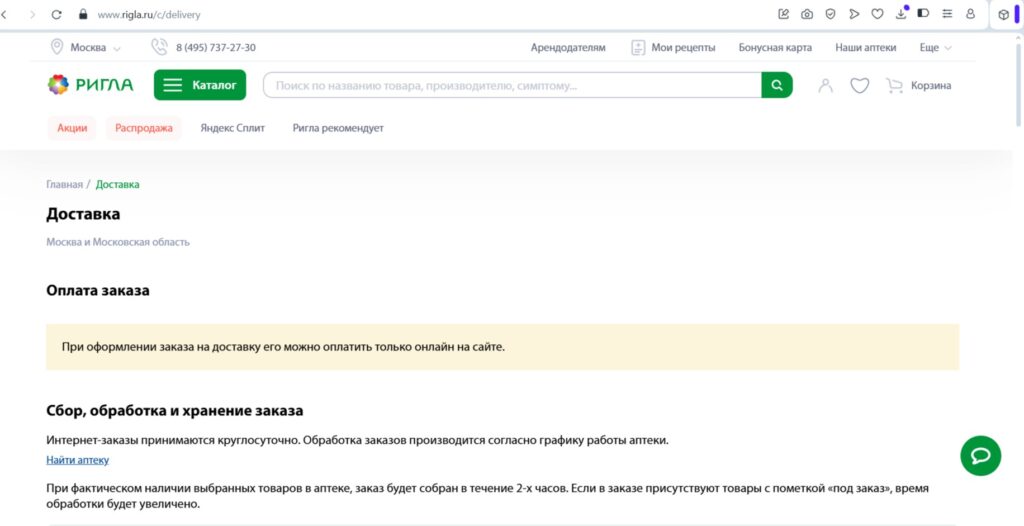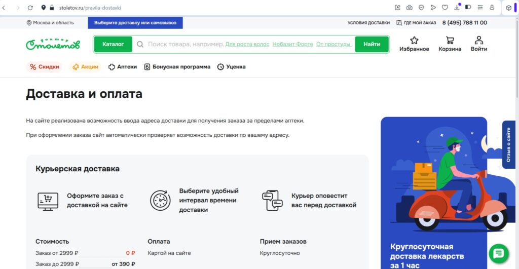 Удобный сервис заказа лекарств, объединяющий крупные аптечные сети России. Клиенты имеют возможность оформить заявку на сайте, выбрав адрес и временной интервал. Автоматизированная система сайта определяет возможность привоза по указанному адресу. При оформлении задания сумма менее 3000 рублей предусматривает дополнительную плату за транспортировку, начиная от 400 рублей. При достижении суммы в 3000 рублей доставляется бесплатно. Предусмотрена возможность круглогодичной круглосуточной курьерской доставки. Заказчик уведомляется о прибытии курьера заблаговременно. Оплата возможна картой на сайте, что упрощает процесс расчетов. Доступен режим бронирования с последующим забором из ближайших аптек. Система поддерживает оплату картами или наличными. Готовые заказы хранятся до 3-х дней, при необходимости этот период продлевается.