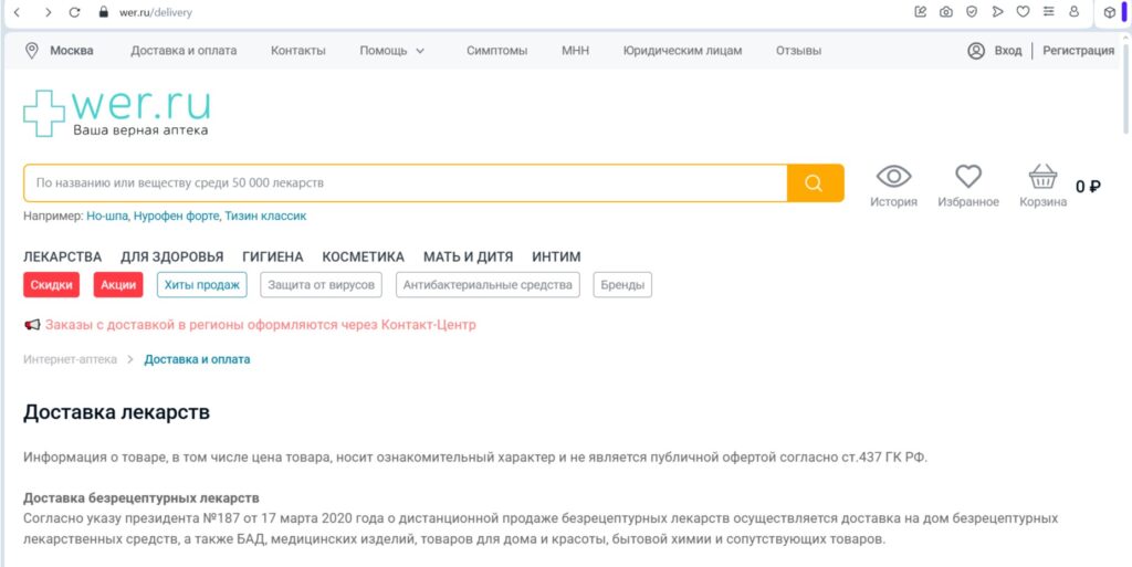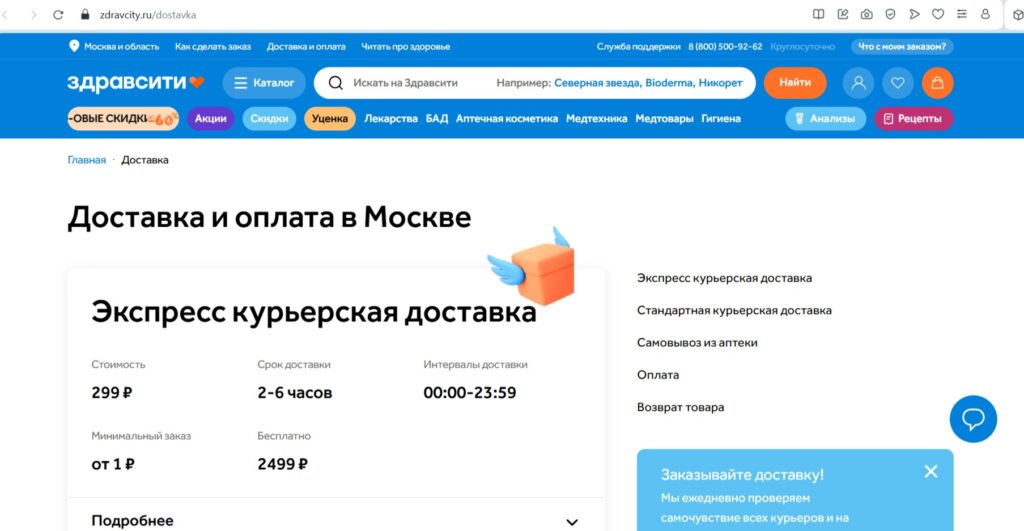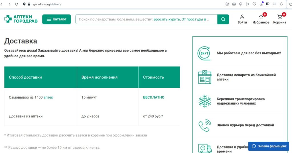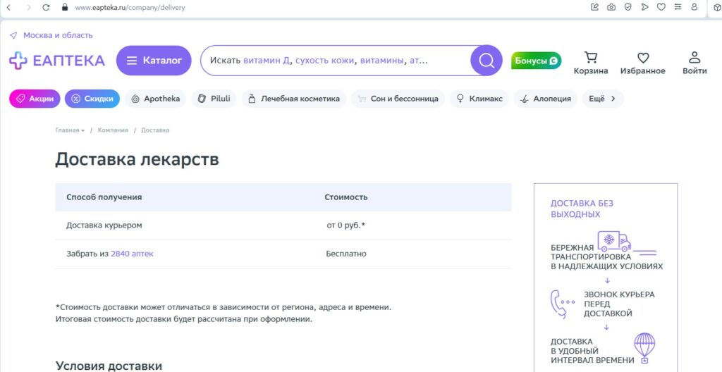 Сервис доставки лекарств домой. Работая без выходных, аптеки обеспечивают бережную транспортировку товаров. Имеет широкую сеть пунктов выдачи, состоящая из более чем 1400 аптек, расположенных по всей территории Москвы и Московской области. Покупатели имеют возможность как самостоятельно забрать заказанный товар в ближайшей аптеке, так и воспользоваться услугой быстрой транспортировки домой. Клиент выбирает нужную позицию на сайте, добавляет ее в корзину и оформляет заявку, после чего лекарства упаковывают и отправляют в пункт назначения. Срок доставки занимает в среднем менее двух часов. Автоматический подбор ближайшей аптеки, исходя из местоположения заказчика. Если требуемый медикамент имеется в наличии, заявка обрабатывается немедленно, если же его необходимо доставить со склада, это займет больше времени. Оплачивается покупка банковской картой онлайн. Частичное получение заказа невозможно: отказываясь от полного набора товаров, покупатель теряет право на компенсацию расходов на транспортировку.
