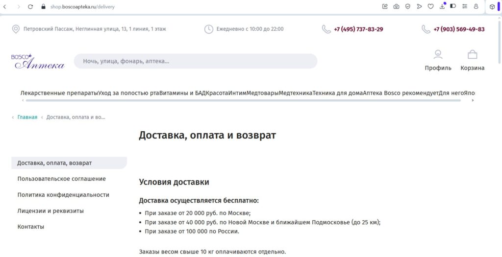 Аптека «Боско» позиционирует себя как специализированный ресурс с внимательным отношением к каждому клиенту и стремлением удовлетворить запросы в лекарствах. Услуги включают бесплатную транспортировку при достижении определенной минимальной суммы. Сайт обеспечивает высокий уровень комфорта при размещении заявки, предлагая простое меню навигации, подробное описание препаратов и возможность получить консультацию специалиста. Политика ценообразования ориентирована на поддержание цен для конечного потребителя. Предоставляются бонусы и акции, направленные на повышение привлекательности ресурса и привлечение новых клиентов. Организация работы персонала построена таким образом, чтобы клиенты получали исчерпывающие рекомендации и могли ориентироваться в ассортименте магазина. Продукция проходит проверку на предмет соответствия международным стандартам качества и сертификации.