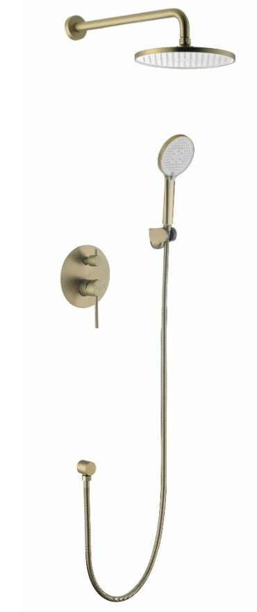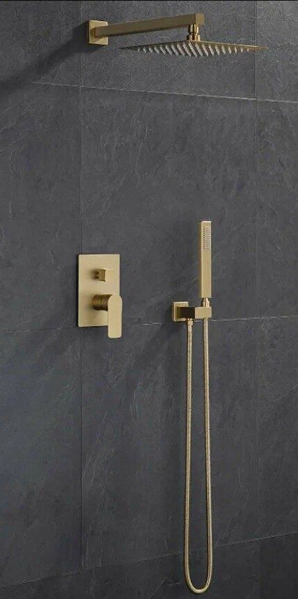 Душевая система скрытого типа выполнена в оттенке матового золота. Модель способна стать настоящей изюминкой ванной комнаты, душевого уголка или кабины. Благодаря лаконичному дизайну и отсутствию лишних деталей возникает визуальный эффект увеличения пространства. В продажны комплект входит лейка тропического душа с настенным креплением и подвижным шарниром, ручной душ, поворотный излив и смеситель. Конструкция оснащена механическим переключателем режимов, шлангом и ручкой для регулировки напора и температуры воды. Тропическую лейку можно легко настроить под удобный угол с учетом личных предпочтений, обеспечив стандартный режим или расслабляющий массаж. Смеситель выполнен из латуни, поэтому отличается надежностью и устойчивостью к негативному воздействию влаги