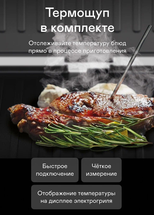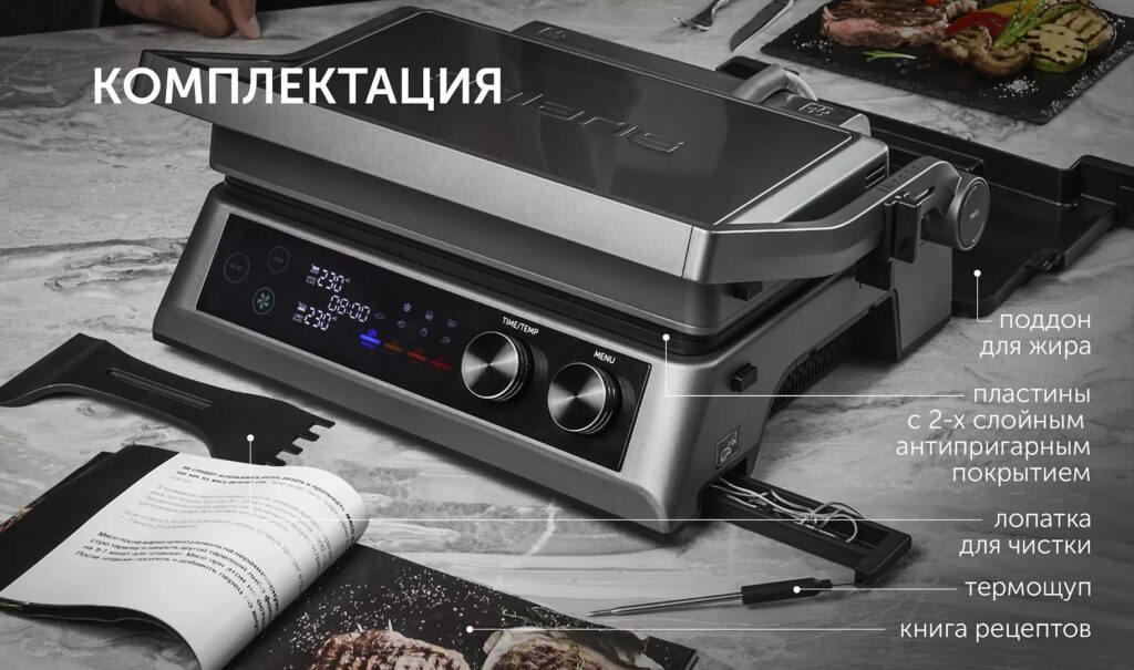 Комплектация: лопатка для очистки панелей, термощуп, поддон для жарки, съемные панели, книга рецептов, памятка для любителей стейков.