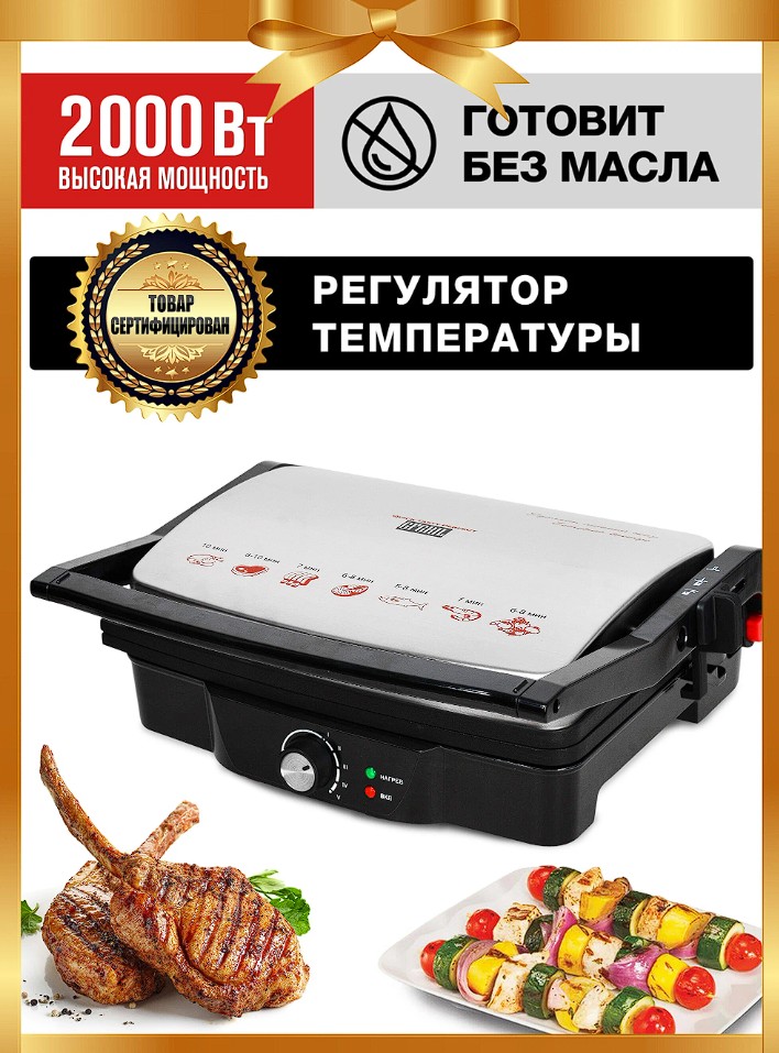 GFGRIL электрогриль /электрический гриль GF-060, антипригарные панели, гриль мощностью 2000 Вт, вертикальное хранение, открывается на 180 градусов Достоинства: