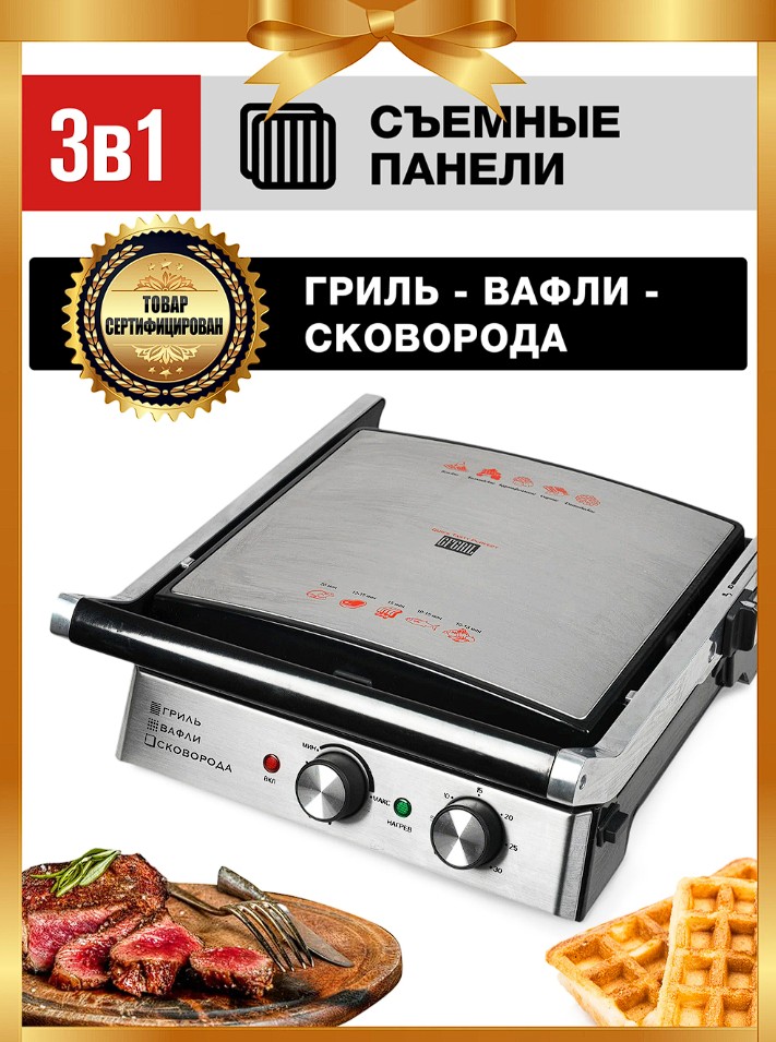 Функциональный гриль для домашнего пользования, рабочая поверхность которого сделана из металла. Можно готовить в трех положениях: