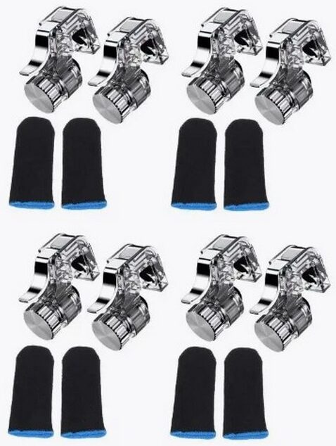 Комплект из 4-х пар контроллеров, сделанных из ABS-пластика, и 4-х пар напальчников позволит обеспечить комфортными условиями игры в PUBG небольшую компанию. После простой процедуры установки на гаджеты толщиной не более 9 мм. скорость стрельбы повышается в несколько раз и практически исчезают ошибки, что позволяет серьезно прокачать геймерские навыки. Помогают в этом и входящие в комплект сенсорные напальчники. Снижают уровень нагрузки на большие пальцы. Работают с устройствами на платформах Android, Windows, iOS. Гарантия – 1 месяц. Средняя цена – 568 руб.