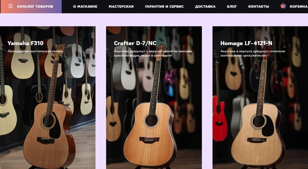ИМ Владимира Лесняка, создателя одноименного ютуб-канала. Владелец сам отбирает модели для каталога, по запросу может проконсультировать покупателя, порекомендовать модель для конкретных целей. Москвичи могут пройти урок игры на гитаре. У компании есть физический шоурум в столице, доставка осуществляется по всей России ТК СДЭК. Стоимость отправки зависит от удаленности населенного пункта, веса и габаритов посылки. Груз страхуется на полную стоимость, поэтому покупатель ничем не рискует. В каталоге есть новые, модели в состоянии б/у. Возможен предзаказ – по запросу модель привезут из-за рубежа. Условия оплаты, сроки поставки обсуждаются отдельно. Программы лояльности нет, но на сайте всем подписчикам ютуб-канала обещают скидку.