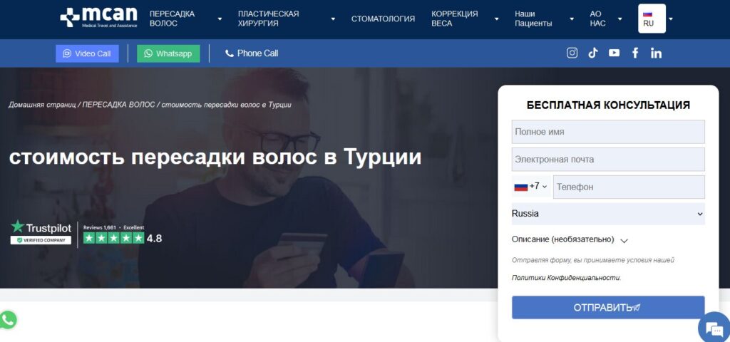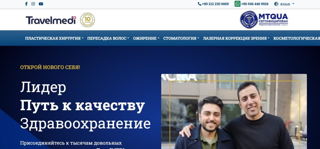 Компания медицинского туризма, состоит из профессиональных врачей, туристических агентов. Имеет сертификат американского American MTQUA (Medical Travel Quality Alliance. Язык сайта можно выбрать из 8 вариантов (есть русский). Получить бесплатную консультацию можно, заполнив форму на странице сайта (ввести имя, мобильный номер, электронную почту, интересуемый вопрос).