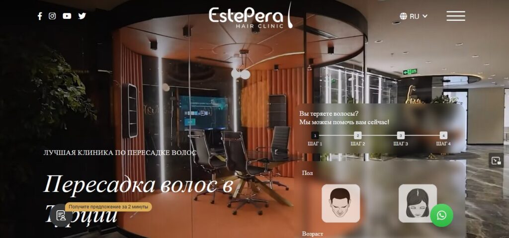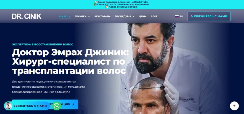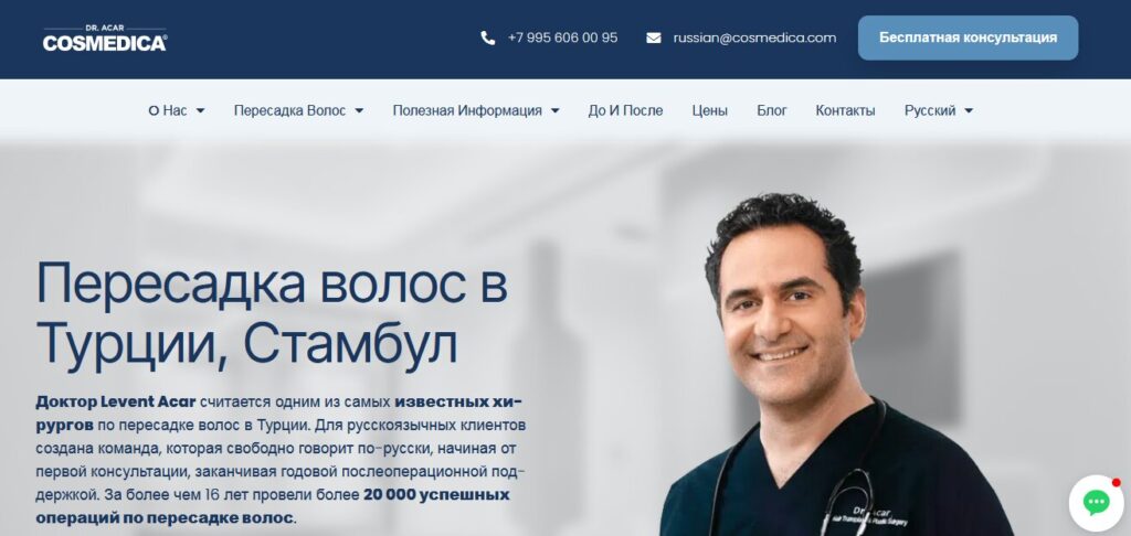 Опыт работы более 16 лет. Проведено 20.000 операций, где приживаемость волос составляет 98 %. Компания имеет 30 международных сертификатов. Современный сайт предоставляет русскоязычную версию, есть номер телефона +7-995-606-00-95, адрес электронной почты. Можно получить бесплатную консультацию (есть выделенное окно услуги). Выделены услуги по пересадке: волос, бороды, бровей, отдельно – женщинам. Главный специалист – хирург, доктором Левент Акар.