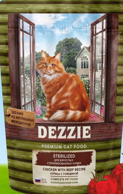 Рецептура разработана специально для стерилизованных животных. Подходит для взрослых и пожилых питомцев с чувствительным пищеварением. В списке дегидратированное мясо птицы, гидролизованный протеин животного происхождения. А также льняное семя, яблоко, брокколи, За счет пониженного содержания углеводов корм обеспечивает организм питомца необходимыми питательными веществами, макро, микронутриентами, минералами и витаминами, но при этом исключает набор лишнего веса. Конечно, при условии выполнения рекомендаций производителя по кормлению. Аллергии не вызывает, перевод с других кормов не требует много времени. В отзывах пишут, что дают DEZZIE даже собакам в качестве полезного лакомства. Цена – от 900 рублей за упаковку 2 кг.
