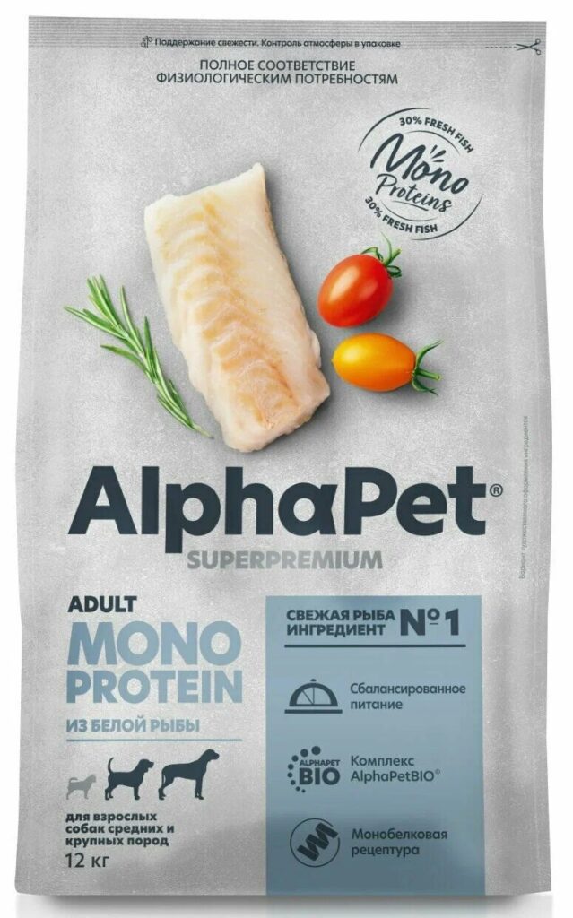корм с гидролизатом белка для собак AlphaPet Superpremium 12 кг Монопротеин из белой рыбы Достоинства: