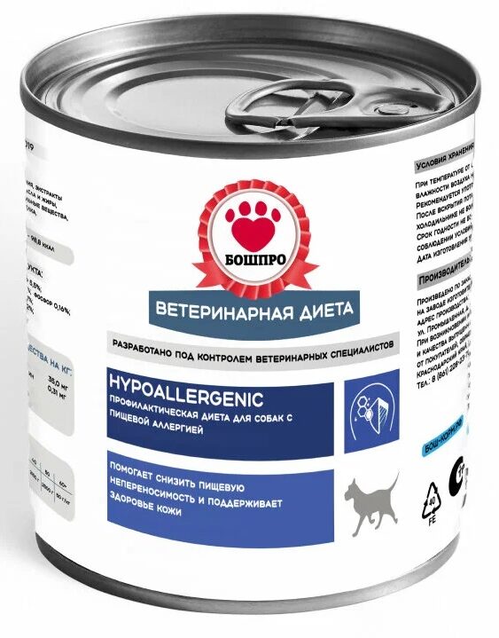Основное назначение — пищевая аллергия и щадящее диетическое питание у собак. Основные компоненты состава: растительные субпродукты, экстракты растительных белков. Обогащено сырье льняным маслом, рыбьим жиром. Каждая порция сбалансирована по содержанию белков, жиров и углеводов. Это наполняет организм домашнего питомца значимыми питательными полезными веществами. В дополнение добавлены рисовая крупа, минеральные вещества, комплекс гидролизованного соевого белка, гидролизат субпродуктов индейки. Стоимость — 1782 руб.
