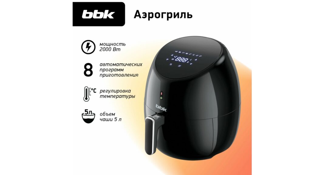 Аэрогриль с антипригарным покрытием BBK AF505D черный, объем чаши 5 л, мощность 2000 Вт, автоматические программы Достоинства: