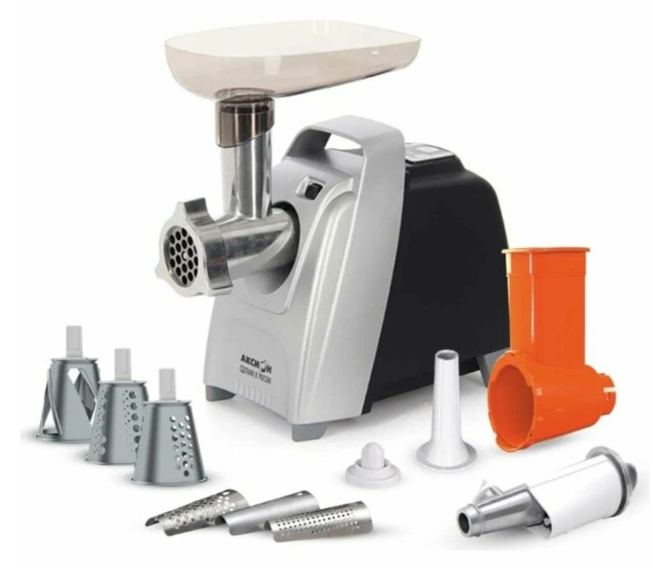 Бренд, придуманный Яндексом. Мощность устройства 2000 Вт, производительность до 3 кг. фарша в минуту. С помощью насадок можно приготовить фарш для котлет и колбас, нашинковать овощи для гарниров и салатов, приготовить кеббе и драники, отжать сок из томатов и ягод. Поддерживает непрерывную работу 15 минут, оснащена реверсом, который помогает избавиться от застрявших кусочков и облегчает очистку. Резиновые ножки фиксируют прибор на столе, корпус выполнен из металла. Блок овощерезки, насадки для кебаба и колбас, соковыжималку можно мыть в посудомойке, диски очистить с помощью специального устройства, входящего в комплект. За защиту мотора отвечают система от перегрева и перегрузок. Толкатель помогает загружать продукты. Цена 7719 руб.