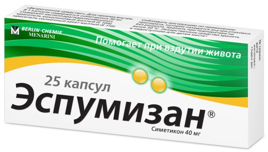 Пеногаситель. Действующее вещество – симетикон, химически инертное, не всасывается в кровь, не выводит минералы, витамины при длительном приеме. Назначается при метеоризме, отравлении моющими средствами, перед исследованиями внутренних органов (рентген, УЗИ). Форма выпуска – капсулы, эмульсия, саше, капли (детям). Производитель – Берлин-Хеми/Менарини, Германия. Стоимость – от 450 руб. (25 капсул) до 670 руб. (капли 50 мл).