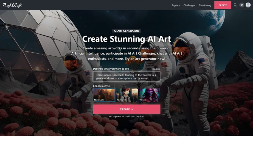 NightCafe — нейросеть, созданная как генератор NFT с поддержкой блокчейна, что означает, что права на каждое созданное изображение принадлежат его создателю. Сайт работает только на английском языке, но имеет интуитивно понятный интерфейс. Нейросеть способна создавать варианты в различных стилях, начиная от космического эффекта и заканчивая масляной живописью и стимпанком.