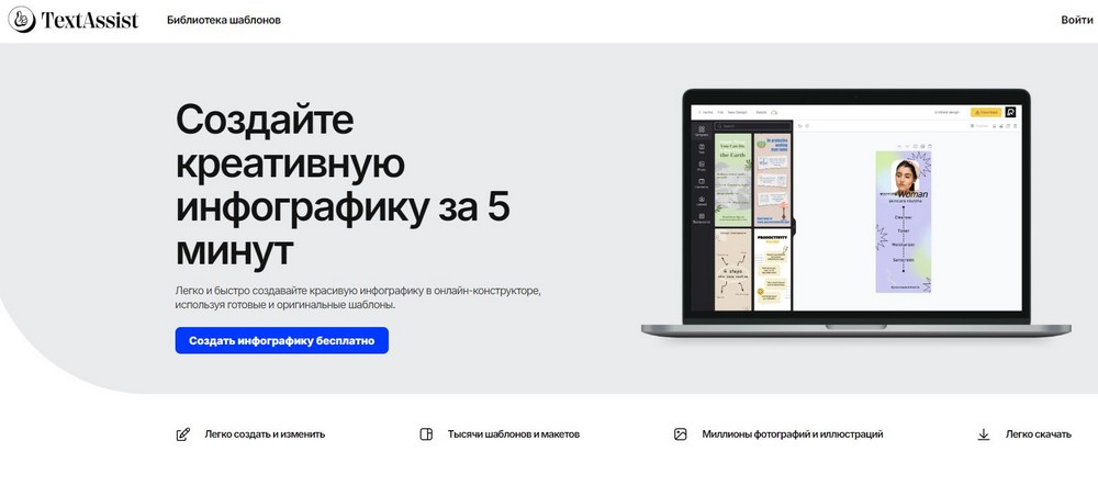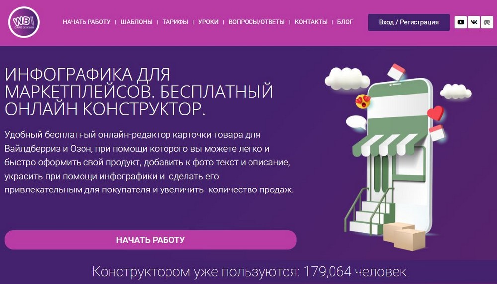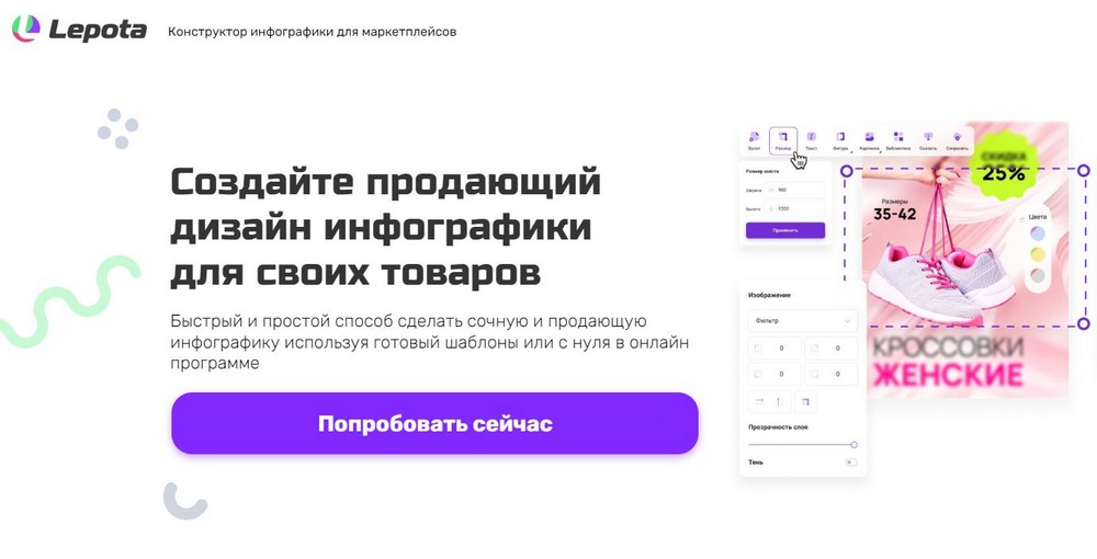 Увлекательный сервис для формирования сочной и продающей инфографики с нуля и без необходимости скачивания программ на ПК. Вся процедура выполняется в режиме онлайн, и благодаря этому работа всегда будет храниться в надежном месте, в отличие от жесткого диска. Всё, что требуется – проделать четыре шага: подобрать наиболее подходящий дизайн из каталога, или вставить свой, после чего загрузить фото товара и внести корректировки. Далее сделать к нему описание, добавить дизайнерские иконки и экспортировать изображение в маркетплейс. Цена: начальный уровень– 690 ₽ на 30 дней, стандартный – 1290 ₽, оптимальный – 3490 ₽.
