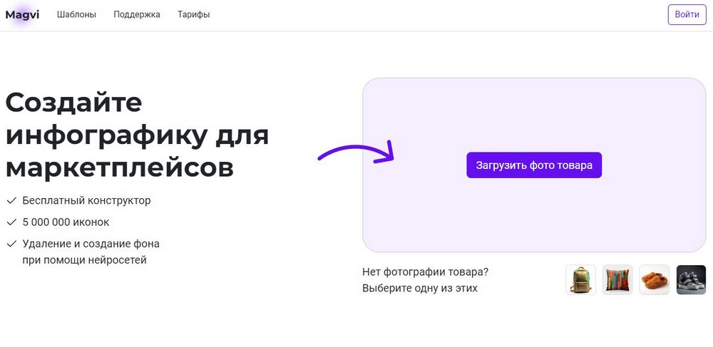 На главной странице сайта можно сразу загрузить фото товара и перейти к оригинальному оформлению. Доступно удаление и создание фона с помощью ИИ. Если своя картинка продукта отсутствует, можно выбрать что-то подходящее из предложенного списка. Есть возможность изменения цвета любых элементов, обозначение преимуществ товара с помощью иконок и определение оптимального шрифта. Стоимость: Free — 3 скачивания, 5 генераций фона в месяц. 490 ₽ — безлимит по загрузке. 990 ₽ — 100 генераций фона.