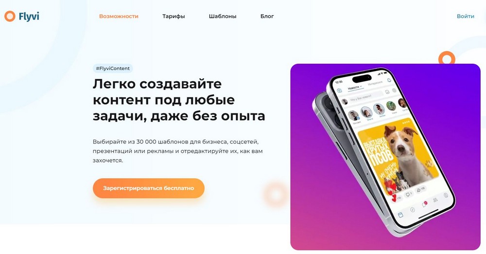С этим сервисом отпадает необходимость в дизайнерских навыках. Работа выполняется в браузере, поэтому нет необходимости скачивать дополнительный софт. Благодаря готовым заготовкам можно сэкономить на поиске идей. Достаточно заменить текст, цвет и изображение. Понравившийся дизайн наверняка удовлетворит запросы потенциальных клиентов. Цена: старт – бесплатно, Pro – 499 ₽, Business — 3600 ₽.