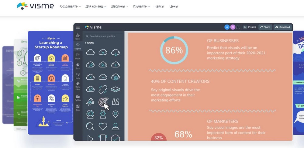 - Наличие библиотеки визуальных элементов, таких как иконки, иллюстрации и фотографии, позволяет пользователям обогатить свои инфографики и сделать их более информативными и привлекательными. Также полезна возможность загружать собственные изображения и графические элементы.