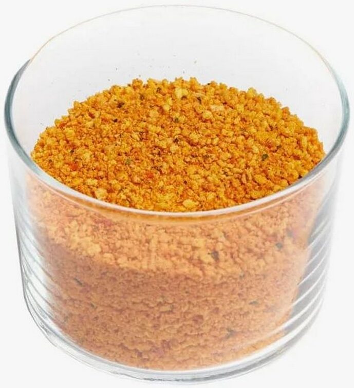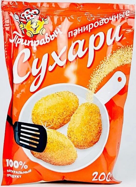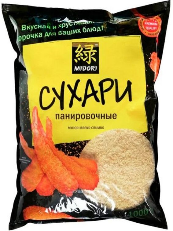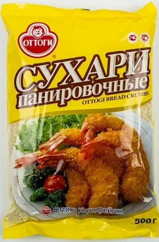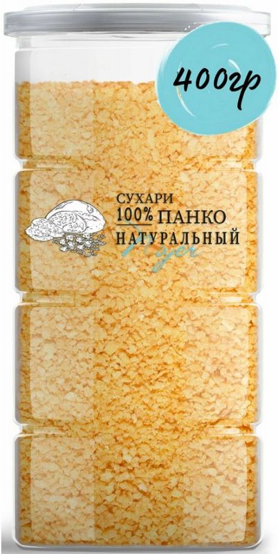 Пшеничные сухари для обсыпки кулинарных деликатесов. Красиво выглядят на блюде и придают ему неповторимый вид благодаря хрустящей корочке, которая снижает потерю влаги. Также исключается риск прилипания к посуде во время обжарки. Заявлена совместимость с креветками, мясом, нагетсами. Цена: 280 ₽ за 500 г.