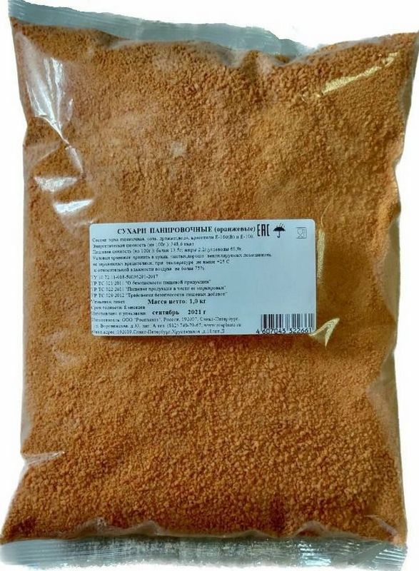 Оранжевые пшеничные сухари, обеспечивающие блюдам румяную поверхность для сохранения сочности и вкусовых качеств. Пригодится для котлет, рыбы, овощей, кляра. Стоимость: 300 ₽ за 1 кг.