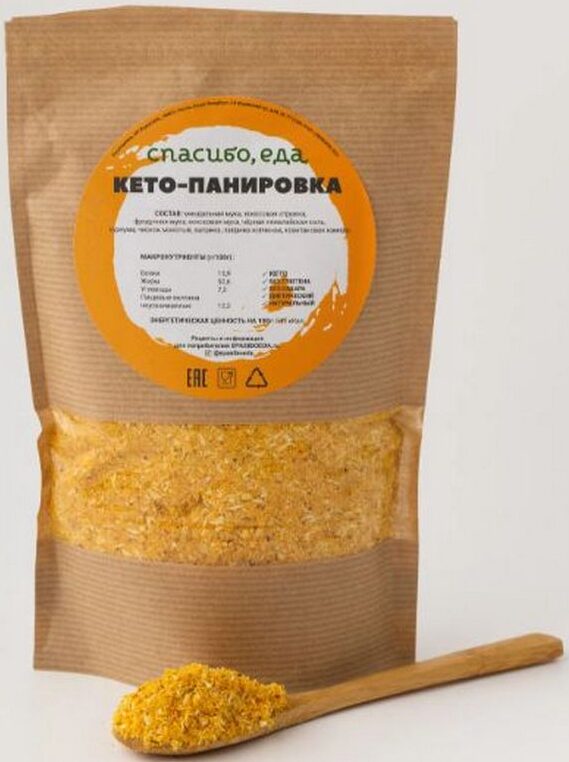 Рассматриваемая кето-панировка подойдет для куриного или индюшиного филе, рыбной или креветочной основы, твердых сыров. Одной упаковки хватит на 2 кг. свежего мяса, причем она позволяет трехкратно увеличить его энергетическую ценность, а объем полезных жировых веществ возрастает в 9 раз. Ореховая панировка наделяет блюда красивым хрустящим кляром без искусственных добавок. Стоимость: 1100 ₽ за 410 г.