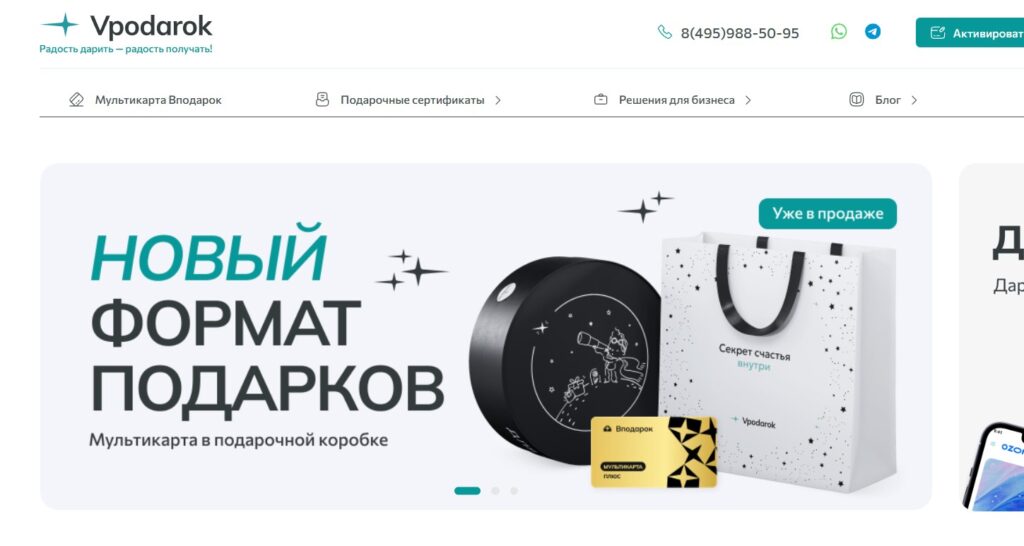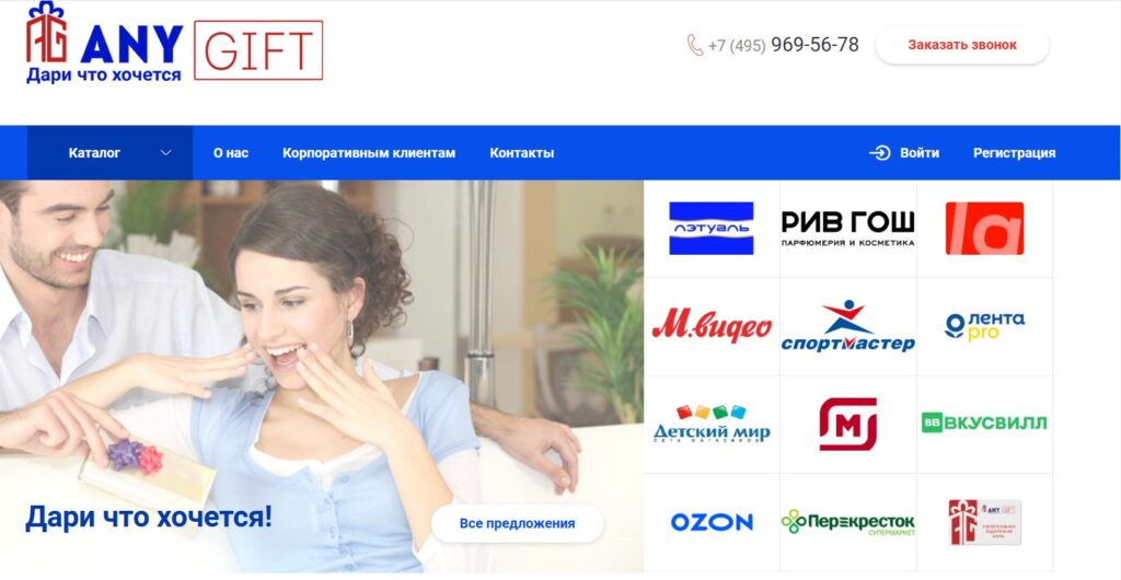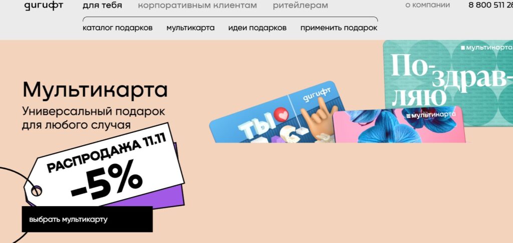 Предлагает подарочные карты для любимых магазинов, уютных СПА, изысканных ресторанов и даже для планирования путешествий. Более 200 брендов собраны здесь. Минимальная сумма – 200 рублей. Сертификат действует от 3 месяцев. Можно выбрать электронный вариант или пластиковую карту.