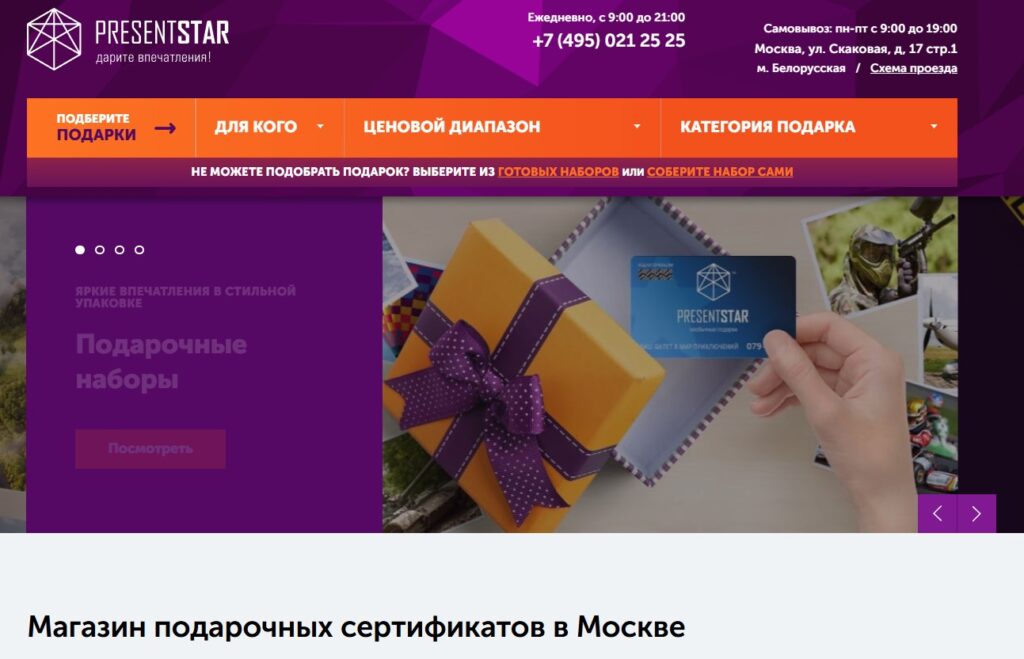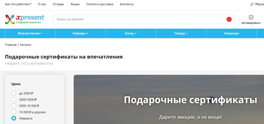 Работает уже 20 лет, помогая дарить незабываемые впечатления. Здесь собрана огромная коллекция на самые разные виды досуга. Минимальная сумма – 2000 рублей. Презент действует целый год. Получить его можно в электронном виде или в элегантной подарочной коробке.