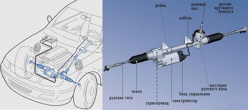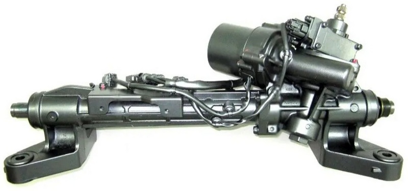 В данному случае рейка дополнена электроусилителем. На торсионном вале располагается датчик, который отслеживает повороты рулевого колеса. На основе данных о повороте, приводится в движение коленчатый вал и одновременно регулируется скорость. Далее встроенный моторчик сам доводит поворот рейки и колеса.