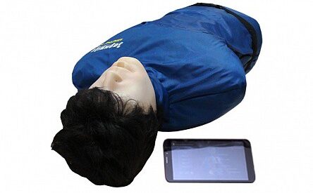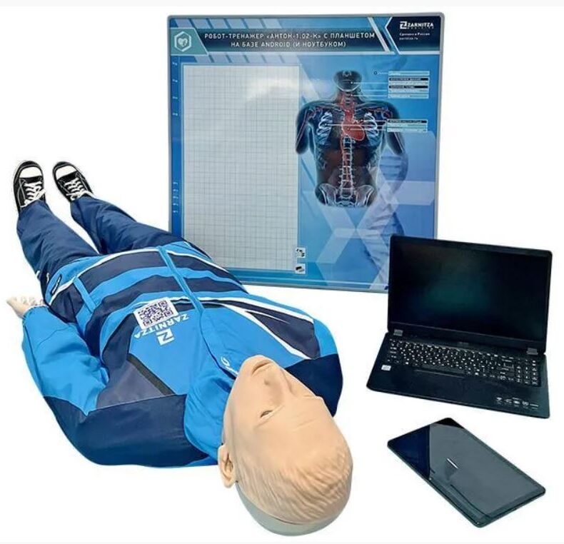 Тренажер представлен в виде торса с головой, для отработки сердечно-легочной реанимации. Имеется беспроводной планшетный компьютер.