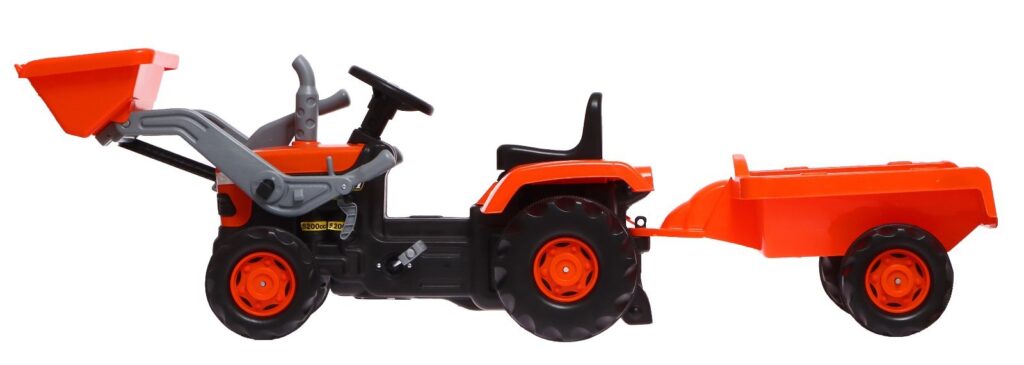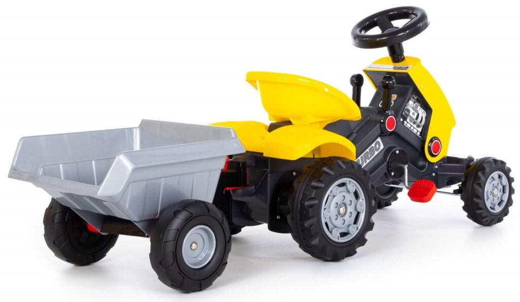 Машинка стилизована под трактор, у нее даже есть полуприцеп, в котором ребенок сможет перевозить игрушки, его можно совсем убрать при необходимости. Корпус пластиковый, крепкий (по отзывам запросто выдерживает столкновения со стенами, мебелью). Сиденье регулируется. В управлении максимально простой, может двигаться вперед-назад. Ход педалей плавный, не требует никаких усилий. В отзывах пишут, что на этом веломобиле гоняют даже двухлетки.