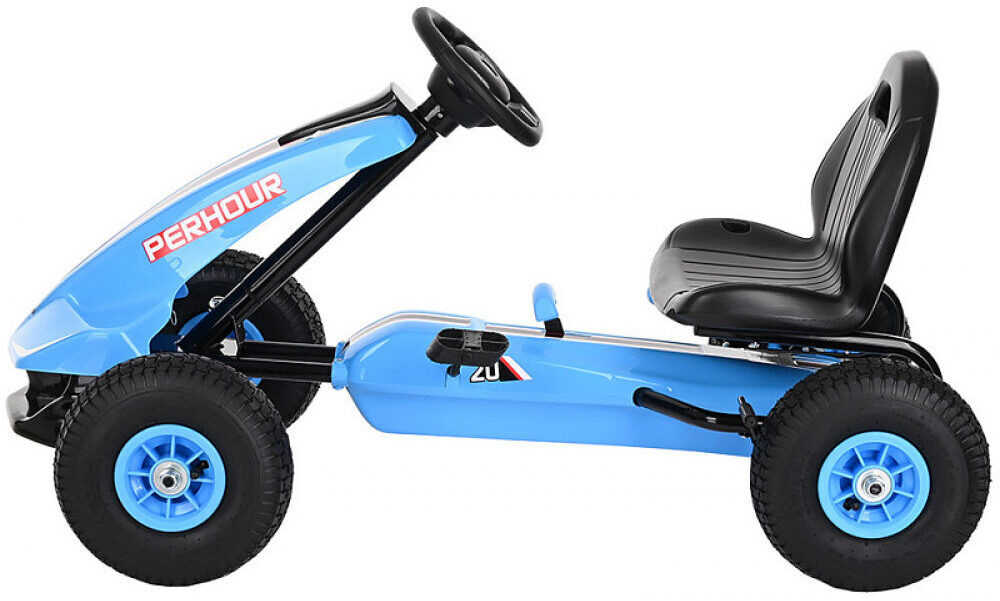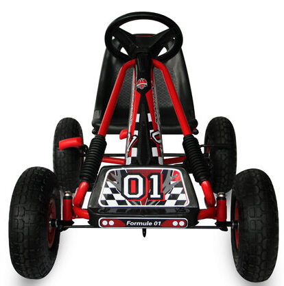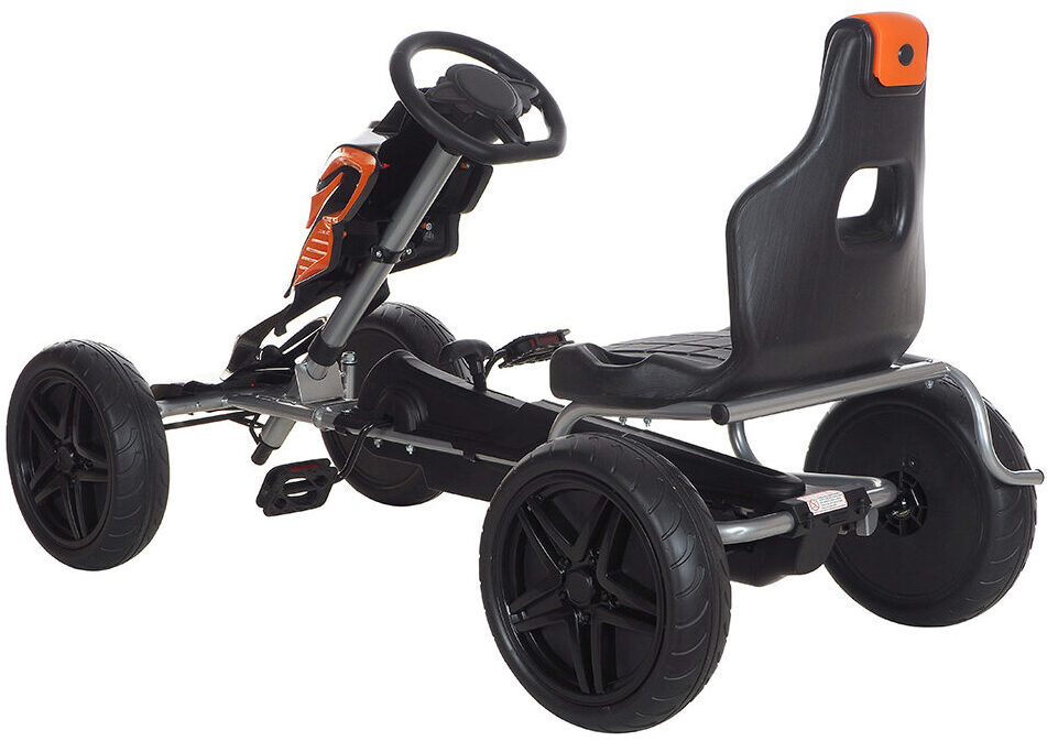 По дизайну сильно напоминает настоящий гоночный болид. Из особенностей – облегченный металлический каркас, надувные колеса. Педальный и ручной тормоз, а также встроенный рычаг переключения скоростей – нейтральный или катания. Тормозить можно вручную или поворотом педалей назад. Положение кресла можно регулировать под рост ребенка. Модель выдерживает максимальный вес в 50 кг., рекомендована для детей 4-8 лет.