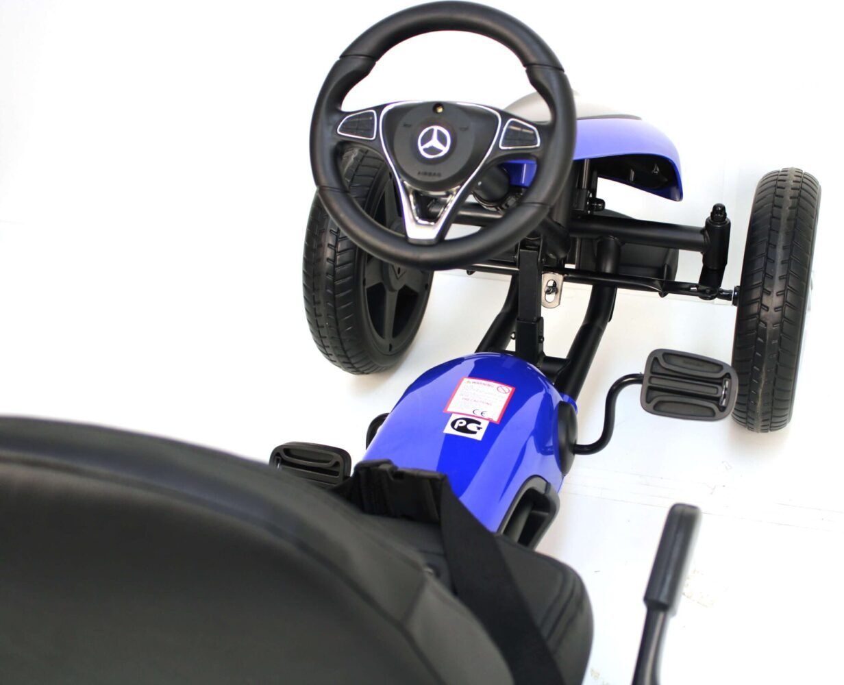 Стильная модель с мягким эргономичным креслом, колесами с пластиковыми дисками и металлической рамой. Колонка и сиденье не регулируются. Есть опции переднего, заднего хода. Для торможения предусмотрен специальный рычаг. За безопасность отвечают высокая спинка, боковые ограничители и ремень. Максимально допустимый вес водителя – 35 кг. На бампере есть лого Mercedes-Benz и представитель бренда уверяет, что это лицензионная модель. Если не смущают шильдики, то вариант отличный. Только стоит мониторить цены у разных продавцов, если заказываете на маркетплейсы. Разница в стоимости по этой модели достигает 40-70 %.