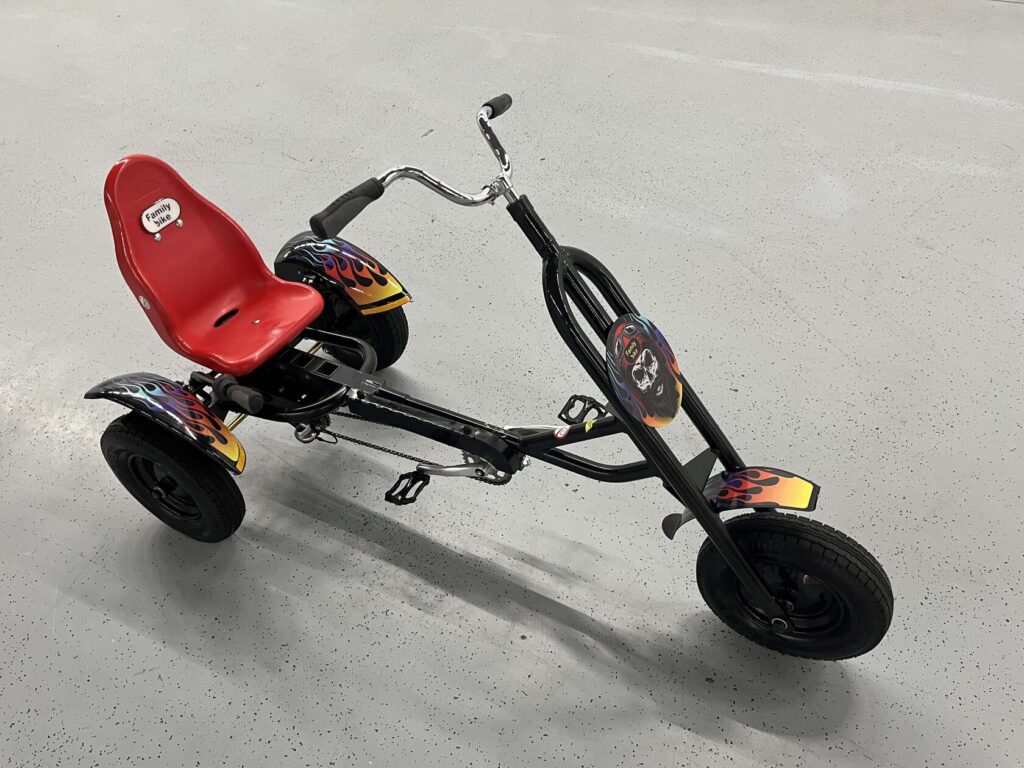 Симпатичная картинговая машинка, с классическим цепным приводом. Может двигаться вперед-назад, имеет переключатель холостого хода. Сиденье регулируется (2 положения – ближе и дальше к рулю), рулевая колонка стационарная. Роль защитной дуги здесь играет увеличенная по высоте спинка сиденья. Рама металлическая, но сам веломобиль достаточно легкий, весит около 12 кг.