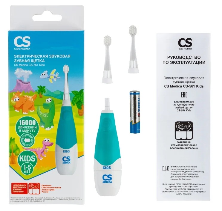 Детская зубная звуковая щётка работающая от одной батарейки. Корпус выполнен из пластика белого цвета. Прорезиненная вставка может быть желтого или бирюзового окраса. Головка небольшого размера, овальной формы. Прибор оснащён подсветкой и таймером.