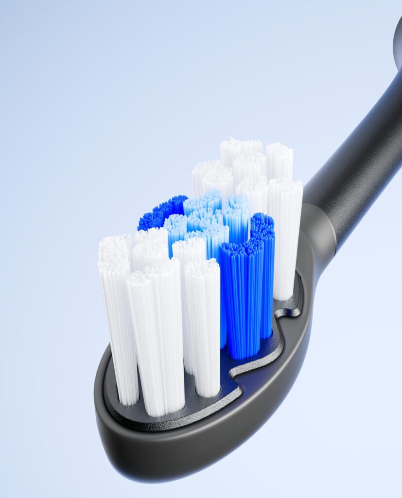 Электрическая щётка с вытянутой формой головки предназначена для отбеливания эмали за счёт щетины разной длины. Помогает бережно и тщательно вычистить придесновую бороздку, отполировать зубы, избавится от неприятного запаха в полости рта.