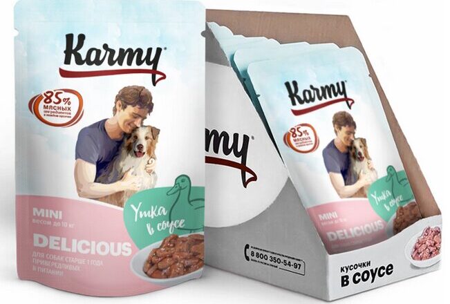 корм для привередливых собак Karmy Mini Delicious для привередливых собак мелких пород старше 1 года Утка Мясные кусочки в соусе 80гр 12шт Достоинства: