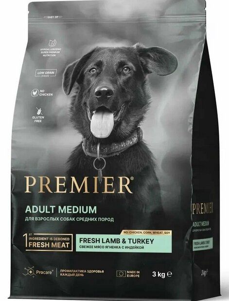 корм для привередливых собак Premier для взрослых собак средних пород, при чувствительном пищеварении, ягненок с индейкой, 3 кг Достоинства: