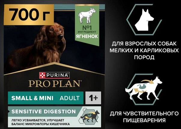 корм для привередливых собак Pro Plan для мелких пород при чувствительном пищеварении с ягненком 700 г Достоинства: