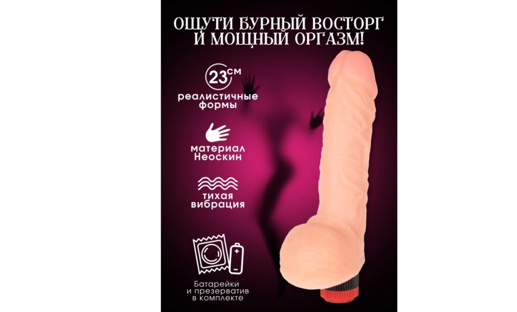 Это реалистичный вибратор, изготовленный из материала, напоминающего человеческую кожу. Этот изысканный интимный аксессуар предназначен для того, чтобы дарить своей обладательнице огромное удовольствие и многократные интенсивные оргазмы. Этот вибратор в форме фаллоса длиной 23 см, с мощной вибрацией 15 см и диаметром 4,5 см работает от батареек. Скорость вибрации можно легко регулировать с помощью кнопки внизу. Более того, этот женский вибратор полностью не имеет запаха и может использоваться со смазочными материалами.