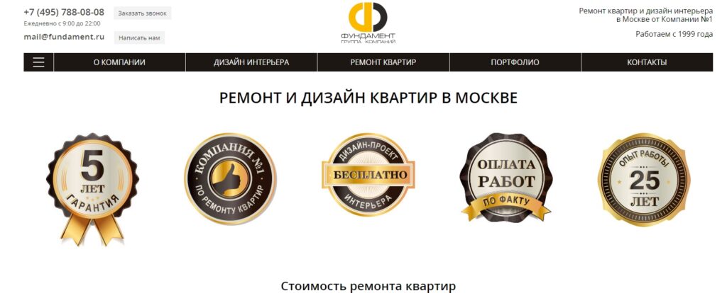 Группа компаний «Фундамент» — это ведущая организация в Москве и ближайшем регионе, которая специализируется на комплексном создании жилых интерьеров. Компания предлагает услуги по разработке дизайн-проектов, ремонту и меблировке помещений. Основанная в 1999 году, компания «Фундамент» за годы своей работы стала надёжным партнёром для многих клиентов. В настоящее время штат компании насчитывает более 700 сотрудников, включая 35 архитекторов-дизайнеров, 22 производителя работ и более 100 строительных бригад.