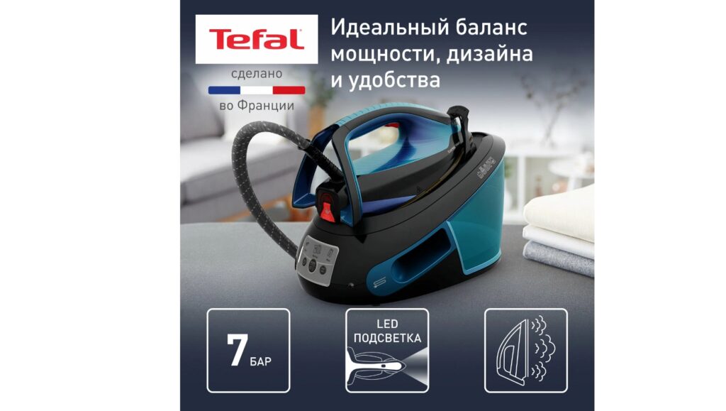 Парогенератор Tefal Express Vision SV8151E0 с паровым ударом 500 г/мин, умной LED-подсветкой, 2800 Вт, черный/синий Достоинства: